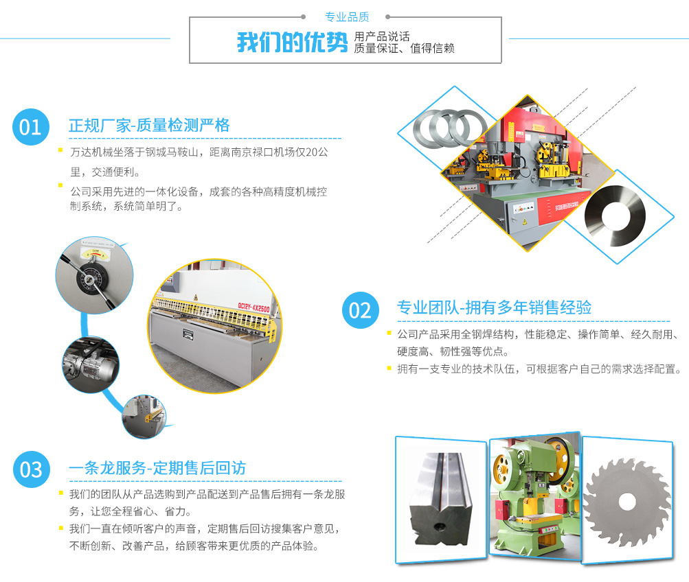 馬鞍山萬(wàn)達(dá)機(jī)械科技有限公司是在新形勢(shì)下投資新建的高新技術(shù)企業(yè),成立于2013年,專(zhuān)業(yè)生產(chǎn)銷(xiāo)售各類(lèi)折彎?rùn)C(jī),剪板機(jī)、卷板機(jī)、沖壓機(jī)、鱷魚(yú)式剪切機(jī),金屬液壓打包機(jī),液壓聯(lián)合沖剪機(jī),數(shù)控刀模具等。經(jīng)營(yíng)過(guò)程中采取先進(jìn)管理模式,引進(jìn)先進(jìn)的技術(shù),在產(chǎn)品質(zhì)量上不斷向更高層次邁進(jìn)。在人力資源開(kāi)發(fā)中,堅(jiān)持“以人為本”的管理理念,專(zhuān)業(yè)為航空、輕工、冶金、化工、建筑、汽車(chē)、電力、裝潢等行業(yè)提供所需要的專(zhuān)用機(jī)械和成套設(shè)備。 本公司經(jīng)營(yíng)主導(dǎo)產(chǎn)品有:液壓折彎?rùn)C(jī)、剪板機(jī)、卷板機(jī)、沖床,鱷魚(yú)式剪切機(jī),金屬液壓打包機(jī);剪板機(jī)刀片、折彎?rùn)C(jī)模具、圓刀片、攪拌機(jī)合金耐磨等機(jī)械成套設(shè)備和配件。對(duì)于客戶(hù)特殊要求的非標(biāo)準(zhǔn)產(chǎn)品,也是我們技術(shù)開(kāi)發(fā)計(jì)劃中深化改革的一項(xiàng)重大舉措。讓每一個(gè)客戶(hù)滿(mǎn)意,才能真正實(shí)現(xiàn)國(guó)際化,集團(tuán)化的營(yíng)銷(xiāo)市場(chǎng)。通過(guò)經(jīng)營(yíng)過(guò)程中不斷追求...榮譽(yù)資質(zhì)